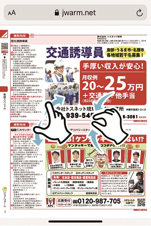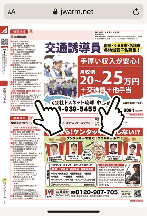 ![]() | ピンチアウト(2本の指を画面上に載せて指と指の間を広げる)すると「拡大」します。 ピンチイン(2本の指を画面上に載せてその間隔を縮める)すると「縮小」します。 |