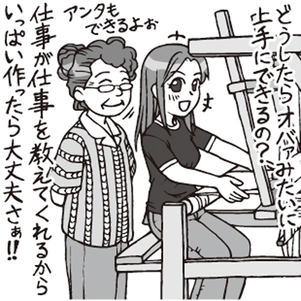 フリーの職人の場合、少しの空き時間も糸を巻いたり、絣(かすり、糸が染まらないようくくったもの)を解いたりと、手を動かし続けます。