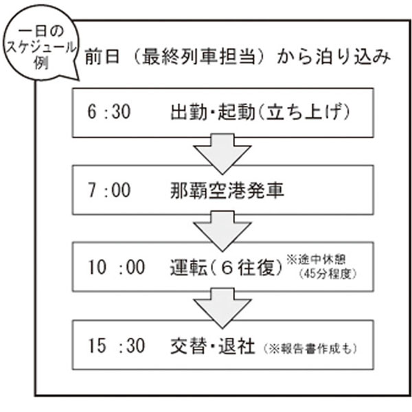 沖縄都市モノレール株式会社で採用試験(一般常識・適性検査・面接)を受け、採用後は駅の係員を一定期間経験します。その後、本土の教習所で机上教習(半年間)と見習い運転士としての実務訓練(半年間)を受け、免許交付となります。