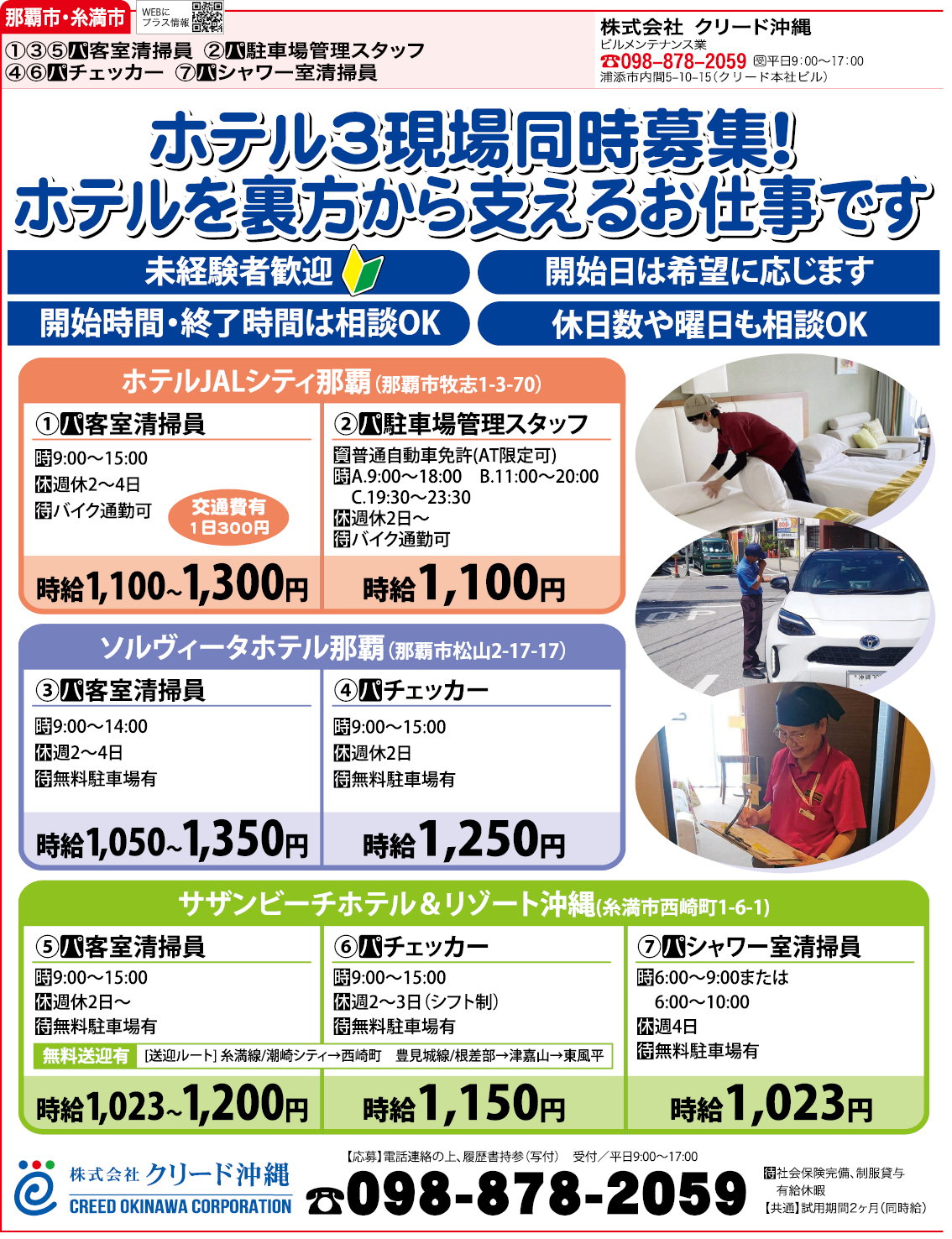 [求人情報]株式会社 クリード沖縄のシャワー室清掃員(糸満市)【3~4h勤務/週休4日/無料駐車場有】