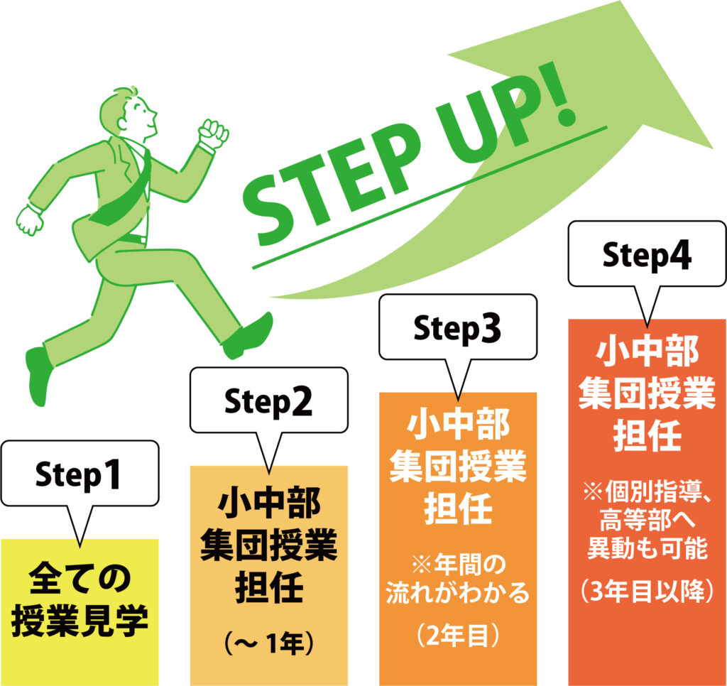 ゆくゆくは、本人の希望とスキルに応じて教科担任・教室運営に関わることもあります。