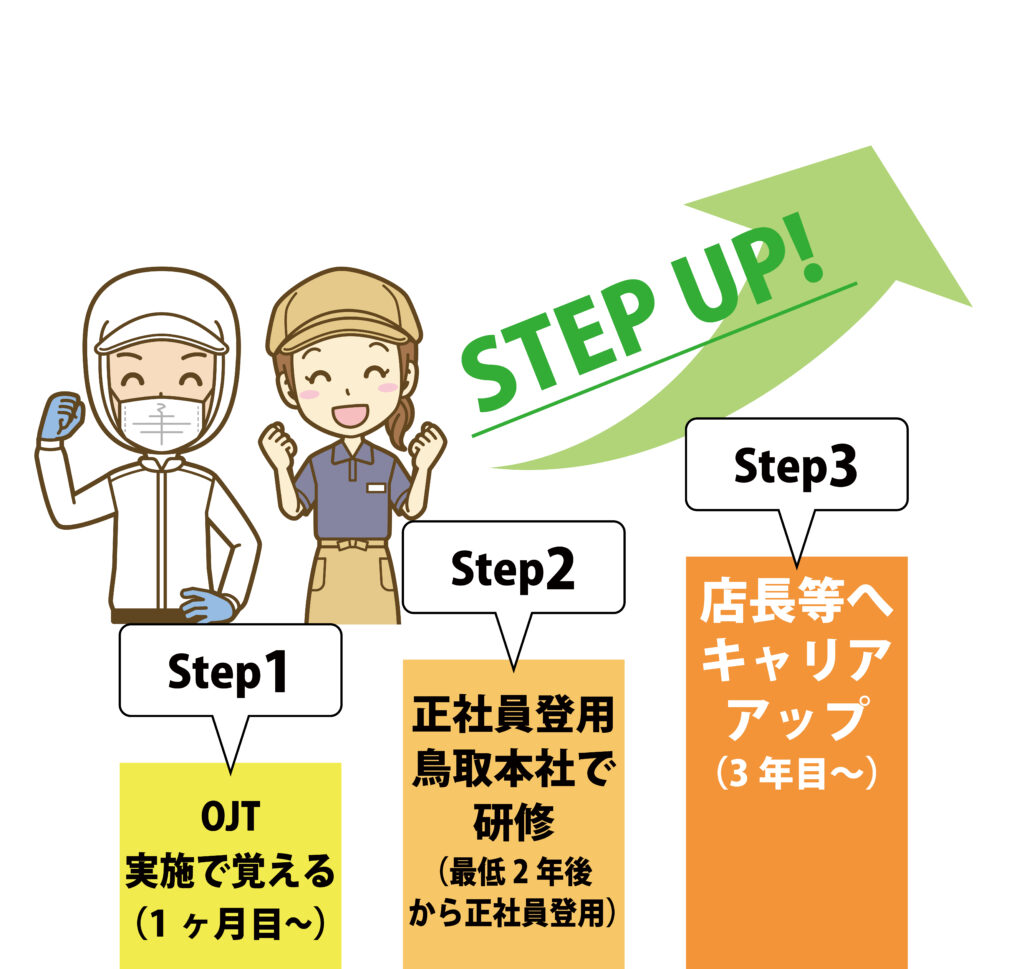 • 正社員登用後は鳥取本社研修に参加(交通費会社負担)。全国の仲間と一緒に学びます