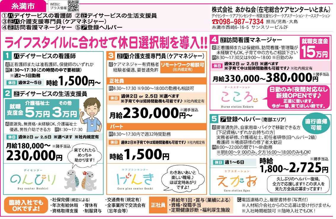 [求人情報]株式会社 あかね会(在宅総合ケアセンターいとまん)の訪問看護師(糸満市)【昇給&賞与有/オープニング募集/就職支度金15万円】