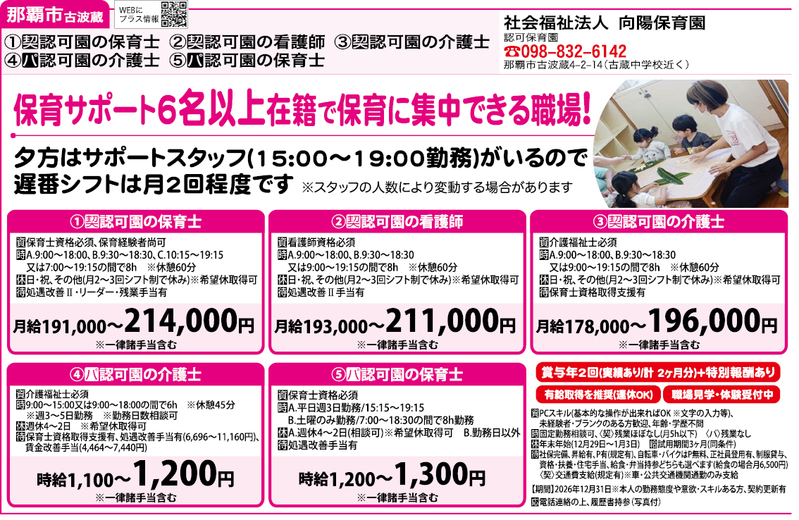 | メモ | 【期間】2026年12月31日 ※本人の勤務態度や意欲・スキルある方、契約更新あり 【園の見学いつでもOK!】 不安な方は就職体験も可。 ※体験の内容は相談に応じます。 お気軽にお問い合わせください。 【プライベートも充実!】 ご家庭の都合と合わせた休暇取得や、有給休暇での連休もOKなので、家庭との両立もしっかりできます!! |