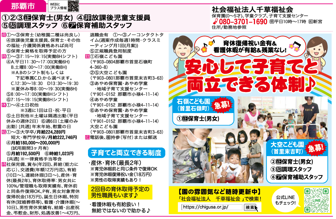 [求人情報]社会福祉法人千草福祉会の調理スタッフ(大空こども園/那覇市首里)【残業なし/結婚・出産祝金/昇給・賞与有】