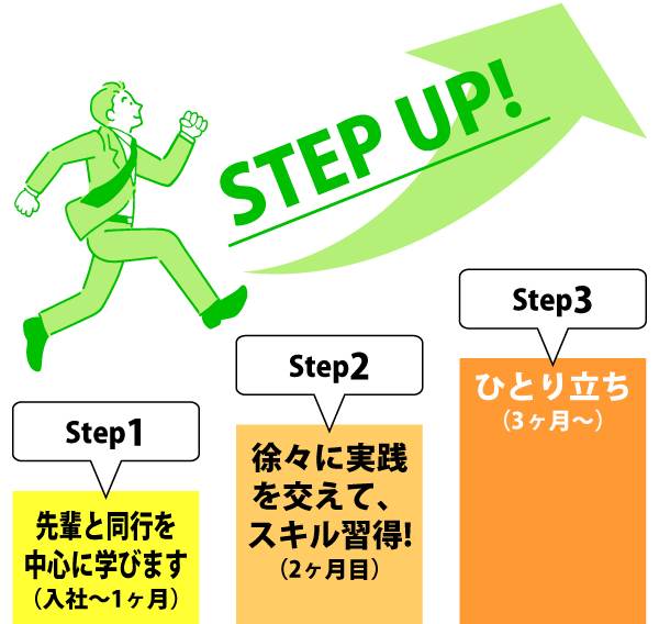 - 先輩と同行しながら個々の成長にあわせて無理なく業務を覚えていけます!